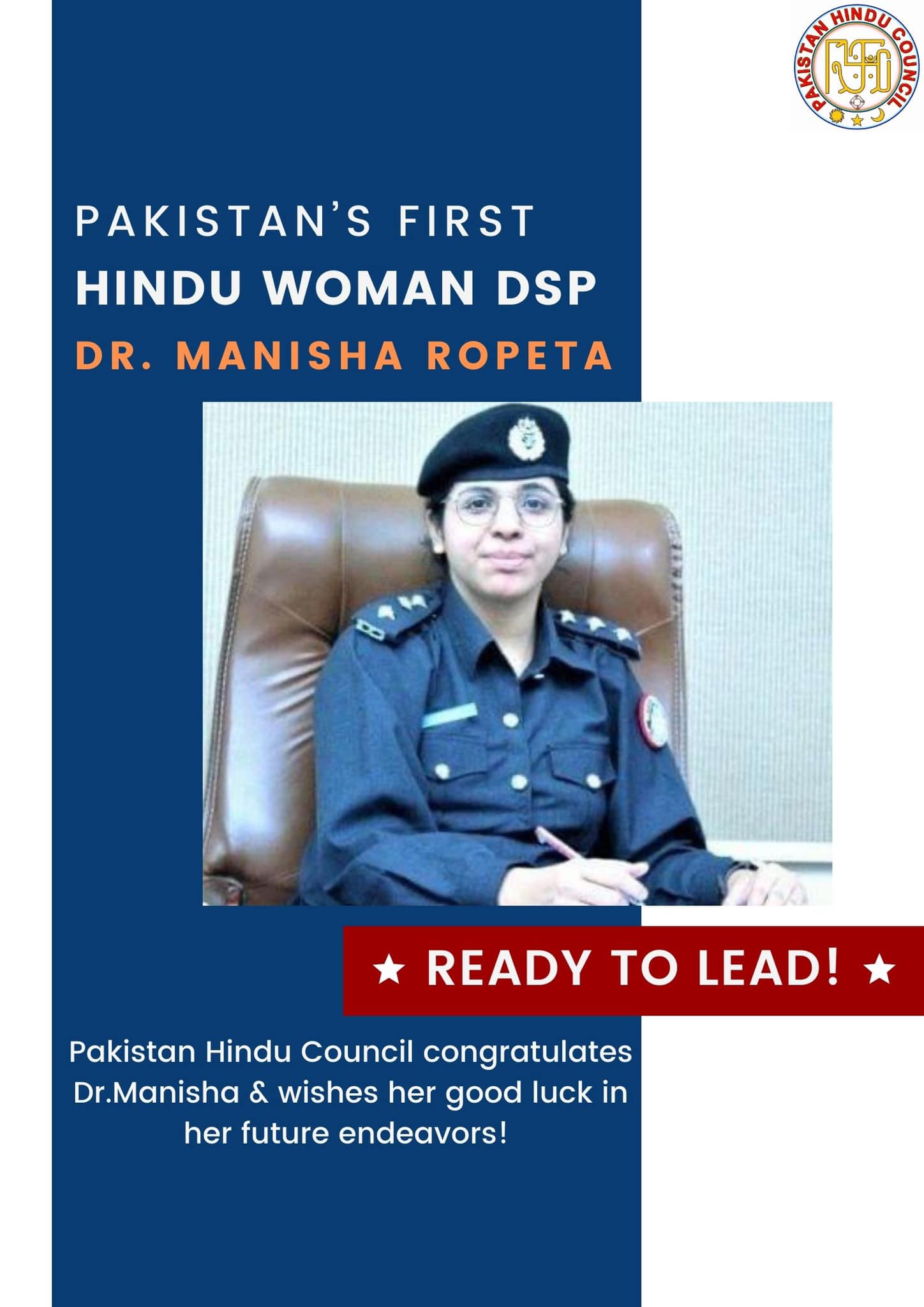 Pakistan Hindu Council gives its heartiest congratulations to DSP Dr. Manisha Ropeta on being the first Hindu woman appointed as the DSP after completing the Sindh Civil Service Examination. It is a proud moment for the whole Hindu Community of Pakistan for this achievement. Pakistan Hindu Council acknowledges this accomplishment and wishes her great success in inspiring more women into the Police Force.
