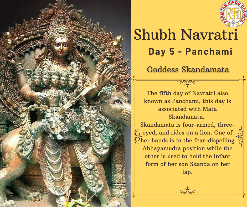 The fifth day of ๐ก๐ฎ๐๐ฟ๐ฎ๐๐ฟ๐ถ also known as Panchami, this day is associated with ๐๐๐ญ๐ ๐๐ค๐๐ง๐๐๐ฆ๐๐ญ๐. Skandamฤtฤ is four-armed, three-eyed, and rides on a lion. One of her hands is in the fear-dispelling Abhayamudra position while the other is used to hold the infant form of her son ๐ฆ๐ธ๐ฎ๐ป๐ฑ๐ฎ on her lap. Lord Shiva and Mata Parvatiโs first son, ๐๐ผ๐ฟ๐ฑ ๐๐ฎ๐ฟ๐๐ถ๐ธ๐ฒ๐๐ฎ, was also known as โSkandaโ. Hence, Maa Parvati is often referred to as Skandmata, which literally means mother of Kartikeya or Skanda.