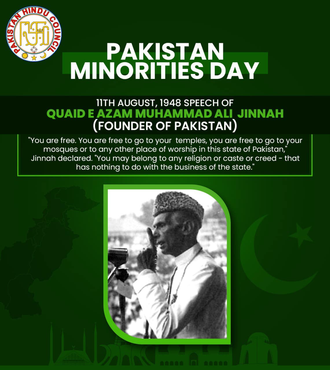In his speech on 11th August 1948, Quaid e Azam Muhammad Ali Jinnah advocated for equal rights for all religious & ethnic communities in Pakistan and further endorsed a strong message for Interfaith harmony in the newly made Pakistan.